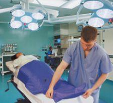 The system uses warming pads that consist of flexible, electrically conductive fabric heaters connected to a controller/power supply. Problems associated with forced air warmers like blower noise, bulk and air blowing in the OR are removed with the system. It also eliminates the danger of hosing burns.