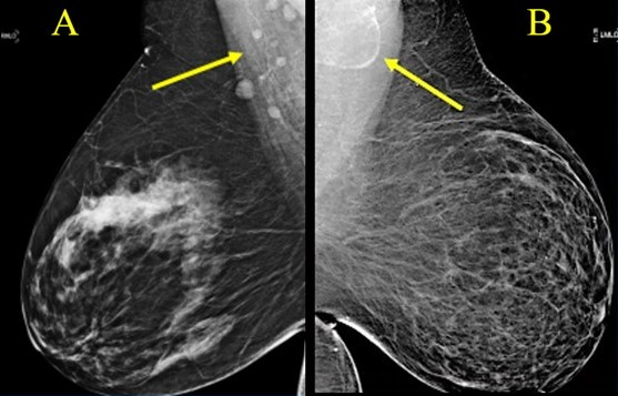 Variable LN morphology on screening mammograms in women with obesity due to ectopic fat deposition. A, Normal axillary lymph nodes measuring < 1.5 cm in 63-year-old woman with BM = 43.2. B, Fat-enlarged axillary node with large fatty hilum measuring 4.2 cm in 52-year-old woman with BMI = 45.8.