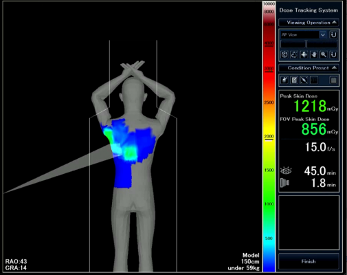 radiation exposure through an color-coded indicator on a 3-D visualization of the patient. The display shows where radiation is being administered on the patient’s body in real time. The technology is intended to help clinicians appropriately distribute skin doses and minimize risk of locally concentrated high exposure.