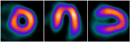 Half-dose stress images acquired with 18 mCi Tc-99 Sestamibi and 11.5 minutes scan time. Photo ourtesy of St. Lukes-Roosevelt Hospital, New York.
