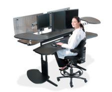 Biomorph’s Flexo PACS desk is designed with a flexible, sit-to-stand design, featuring a height-adjustment range of 17.5 to 51.5 inches high. The desk also sports a triple-level telescopic frame with a crank and electric motors that feature upper and lower height memory, soft start and stop. The keyboard surface is height-adjustable wit positive/negative tilt action (12-inch range above and below the surface). All versions will support three to give of the heaviest monitors, according to the company.