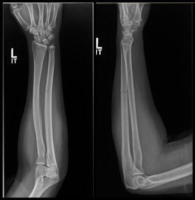 X-ray shows fracture to the ulna bone of the forearm. Image courtesy of RSNA
