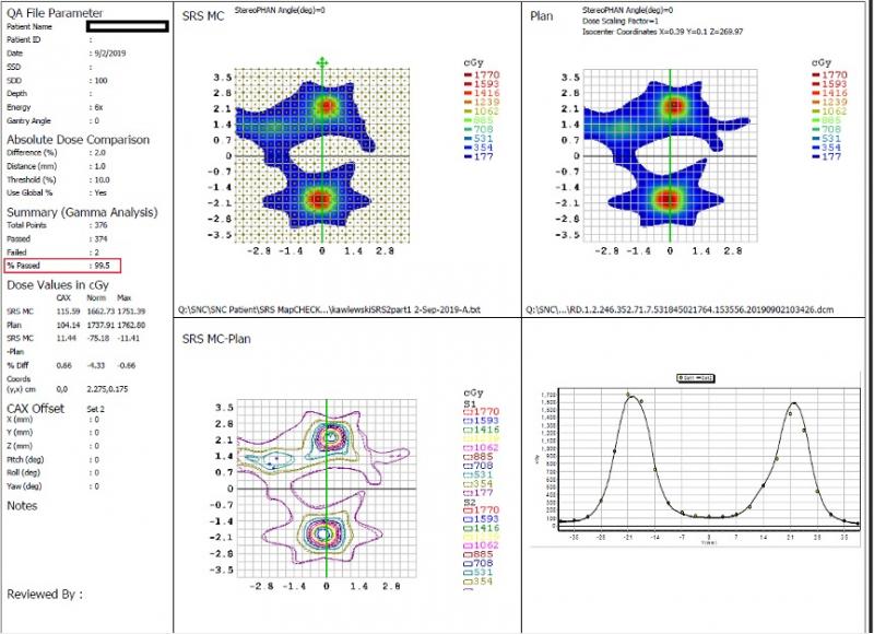 There have been several cases where the angular independence of the device has been helpful in catching multiple lesions on the same plane. For instance, with one particular case, the lesions from the anterior and posterior positions were not in the same plane. One lesion was oversized, while the other was not. In this case, I created a QA plan using SRS MapCHECK. With that plan stored in the system, it was obvious rotation was needed to catch both lesions optimally on the device. When adding the rotational component within the software and delivering the plan, using criteria of 2% dose difference and distance of 1 millimeter, the plan had an excellent passing rate of 97.9.