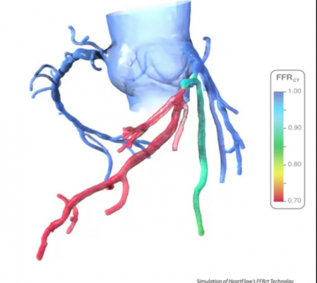 An example of HeartFlow's FFR-CT analysis of blockage severity in a patient's coronary vessels based on a cardiac CT scan.