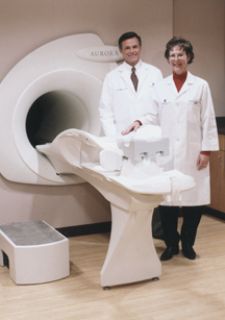 Rebecca G. Stough, M.D., and Alan B. Hollingsworth, M.D., in front of the Aurora breast MRI system.