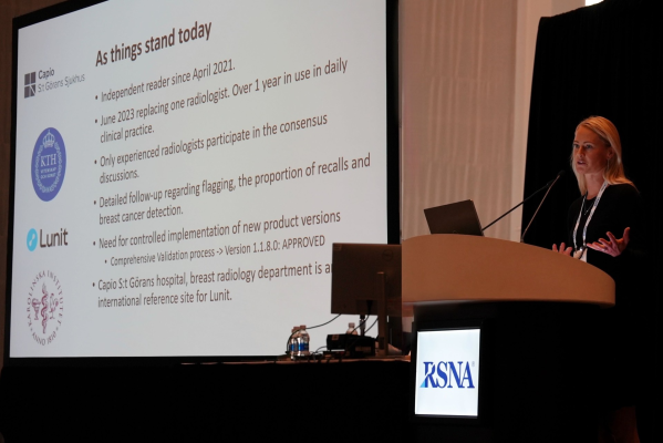 Dr. Karin Dembrower, senior breast radiologist at Capio S:t Göran Hospital, presents findings on the integration of AI in breast cancer screening during an RSNA 2024 session on Dece. 1, 2024. (Photo: Lunit)