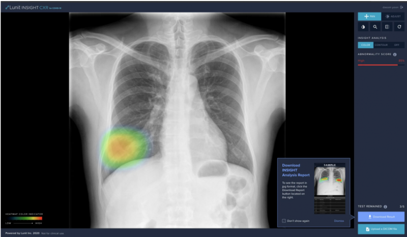 “The AI can instantly interpret chest x-ray images to select suspicious cases that warrant further action to whether or not isolate the patient even before PCR confirmation,” said Kim. “Lunit INSIGHT CXR may be beneficial especially as a triage tool for non-radiologists, or even for non-doctors in extreme cases.”