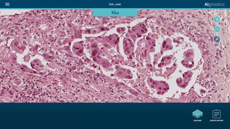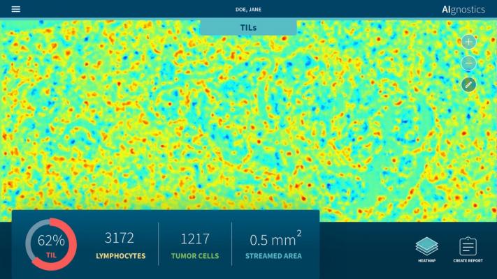 Detection of tumor-infiltrating lymphocytes (TILs) using explainable AI. The AI-technique is used to generate a heatmap showing TILs (red) and other tissues and cells (blue and green). Image courtesy of Klauschen/Charité