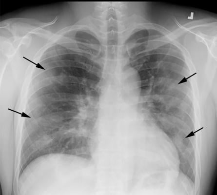 COVID-19 progression over 4 days in a 28-year-old man. This posteroranterior chest X-ray \ shows bilateral multiple peripheral and lower lobe ground glass opacities (GGOs) shown by the arrows. Image courtesy of Margarita Revzin et al.