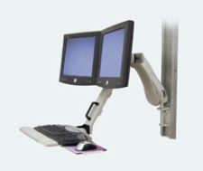The HD Dual Combo arm provides a stable platform for mounting two liquid crystal display (LCD) monitors and a keyboard on a single arm and is counterbalanced for feather-light adjustment. The arm is ideal for any application requiring multimonitor mounting and can be mounted to any vertical or horizontal surface, providing quick access to patient data.