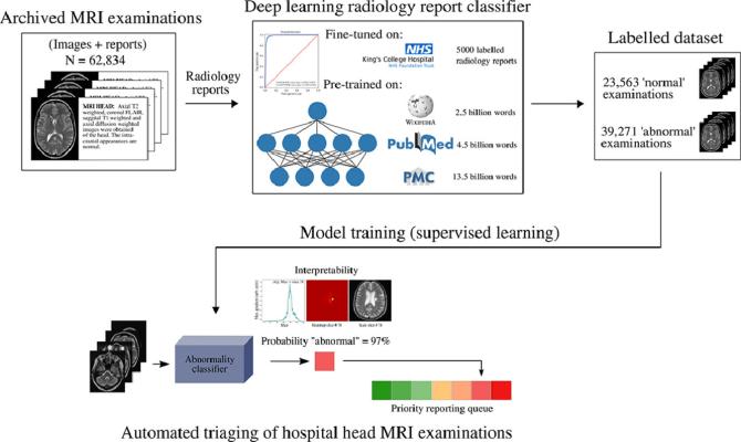 Whilst accessing large hospital datasets is achievable, the data are usually unlabeled. The deep learning framework based on convolutional neural networks used in the current study to flag clinically relevant abnormalities at the time of imaging, could not have been developed without this earlier work which allowed head MRI dataset labeling at scale.