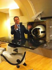 William Hartsell, M.D., conducts a tour of the new CDH Proton Therapy Center in Warrenville, Ill., for local journalists, including this inclined beam treatment room, one of two in the facility.