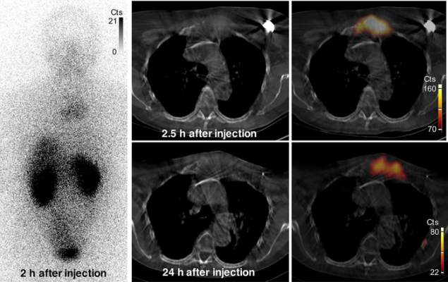 Images of uptake in bone metastasis in patient 2. Anterior whole-body (left) and SPECT/CT (right) images show uptake of 131I-GMIB-anti-HER2-VHH1 at level of large lytic bone metastasis, with soft-tissue component at sternal bone both at 2.5 h and at 24 h after injection. Small differences in area of uptake are explained by differences in patient positioning (arms up at 2.5 h and arms down at 24 h, to maximize patient comfort). Cts = counts. Image created by M. Keyaerts, University Hospital of Brussels (UZ Brussel), Belgium.