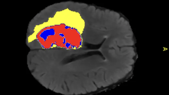 AI-annotated medical image showing enhanced tumor, tumor core and edema regions. Image courtesy of Monash University