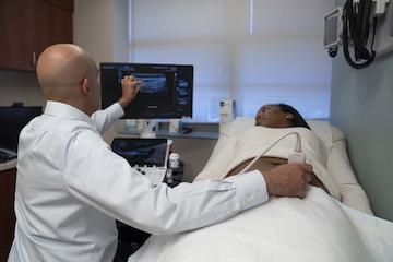 Gastroenterologist Mark Mattar, MD, performs a beside intestinal ultrasound to look for inflammatory bowel disease in a patient at MedStar Georgetown University Hospital.