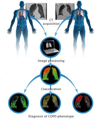 The researchers report that the PRM technique for analyzing CT scans allows them to better distinguish between early-stage damage to the small airways of the lungs, and more severe damage known as emphysema. They’ve also shown that the overall severity of a patient’s disease, as measured with PRM, matches closely with the patient’s performance on standard lung tests based on breathing ability.
