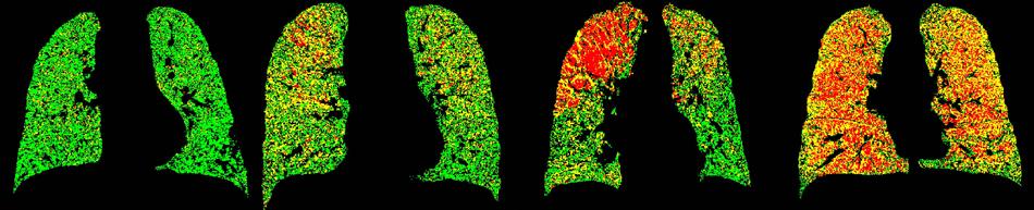 With the PRM technique, the researchers use powerful computer techniques to overlay the CT scan taken during a full inhalation with an image taken during a full exhalation. The overlaid, or registered, CT images share the same geometric space, so that the lung tissue in the inflated and deflated lungs aligns. The density of healthy lung tissue will change more between the two images than the density of diseased lung, allowing researchers to create a 3-D “map” of the patient’s lungs.