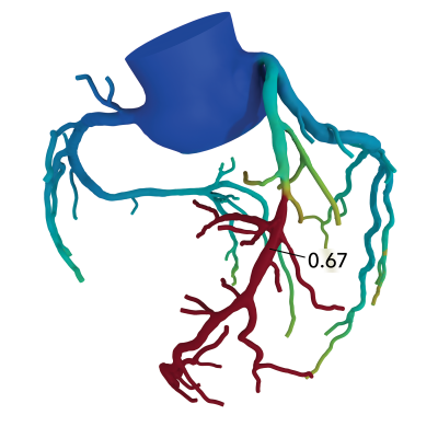 The HeartFlow Analysis is a non-invasive, cardiac test for stable symptomatic patients with CAD, the leading cause of death worldwide. Starting with a standard coronary CTA, the HeartFlow Analysis leverages deep learning and highly trained analysts to create a digital, personalized 3D model of the heart. The HeartFlow Analysis then uses powerful computer algorithms to solve millions of complex equations to simulate blood flow and provides FFRct values along the coronary arteries. This information helps physicians evaluate the impact a blockage may be having on blood flow and determine the optimal course of treatment for each patient. A positive FFRct value (≤0.80) indicates that a coronary blockage is impeding blood flow to the heart muscle to a degree which may warrant invasive management.