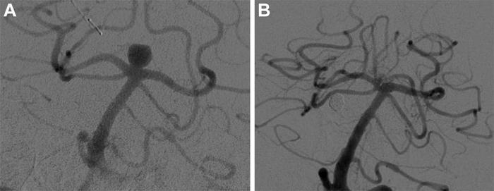 Digital subtraction angiography images show basilar tip aneurysm (A) before and (B) at last follow-up after Woven EndoBridge device placement. Image courtesy of Radiological Society of North America