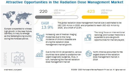 August 3, 2020 — According to the new market research report "Radiation Dose Management Market by Products & Services (Standalone Solutions, Integrated Solutions, Services), Modality (Computed Tomography, Nuclear Medicine), Application (Oncology, Cardiology, Orthopedic), End User (Hospitals) - Global Forecast to 2025", published by MarketsandMarkets, the radiation dose management market is projected to reach USD 422.65 million by 2025 from USD 220.22 million in 2020, at a CAGR of 13.9%.