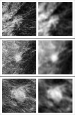 In these three examples of soft tissue lesions, the images are unperturbed on the left column and blurred on the right column. The AI system was sensitive to the blurring, while the radiologists were not. This showed that the AI system relies on details in soft tissue lesions that are considered irrelevant by the radiologists. Image courtesy of Taro Makino, NYU’s Center for Data Science
