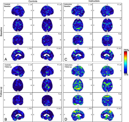 Parametric maps of amyloid deposition in healthy control participants (A and B) and blast-exposed military instructors (C and D) at baseline (A and C) and follow-up (B and D). The blue-to-red scale indicates the frequency of statistically abnormal amyloid uptake in a particular brain voxel. Whereas no abnormal amyloid uptake was identified at baseline or follow-up in healthy control participants (A, B), amyloid deposition occurred most frequently in blast-exposed participants in the superior parietal lobules, precuneus, cingulum, paracentral lobules, and anterior temporal and occipital lobes (D). A = anterior, Ant = anterior, I = inferior, Inf = inferior, L = left, Lat = lateral, Med = medial, P = posterior, Post = posterior, R = right, S = superior, Sup = superior. Image courtesy of RSNA.