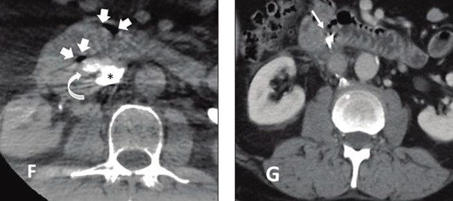 58-year-old patient referred for complex IVC filter retrieval after dwell time of 72 months. F, Axial image from cone-beam CT immediately following retrieval shows two foci of gas in retroperitoneum (white block arrows) and contained contrast extravasation (curved white arrow) from IVC (asterisk). G, Axial image from contrast-enhanced CT performed 1 day post-retrieval shows interval placement of hemoclips in duodenum (arrow), with no further extravasation evident. This was only patient in study sample who experienced major adverse event during complex retrieval.