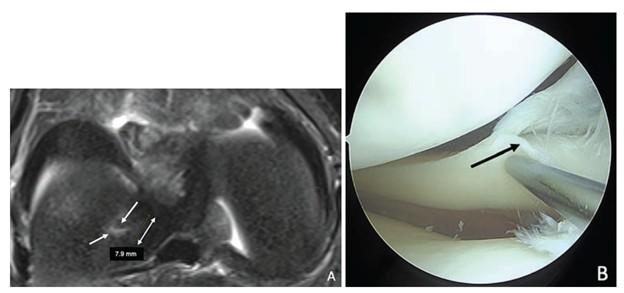 A and B, Axial T2-weighted fat-suppressed MR image (A) and corresponding arthroscopic image (B) in 15-year-old boy show LMORT Type 1 (incomplete tear) lesion (single-headed arrows). Double-headed arrow in A indicates measurement of tear extent from posterior root attachment. (Photo: American Journal of Roentgenology (AJR))