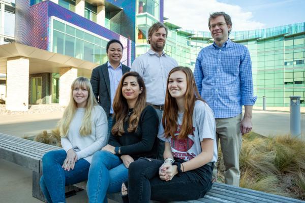UT Dallas faculty members who collaborated with Dr. Jeremiah Gassensmith (center, back), associate professor of chemistry and biochemistry, include Dr. Lloyd Lumata (left, back), assistant professor of physics, and Dr. Steven Nielsen, associate professor of chemistry. Chemistry graduate students in Gassensmith’s lab include (from left, front) Oliva Brohlin, Arezoo Shahrivarkevishahi and Laurel Hagge.