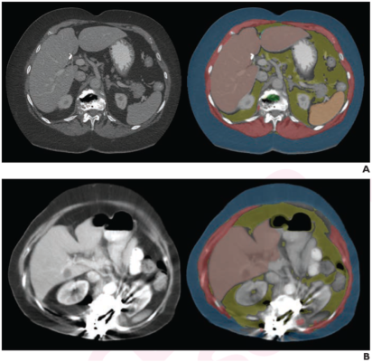 This AJR accepted manuscript included 8,949 patients (mean age, 55.5 years; 4,256 men, 4,693 women) who underwent abdominal CT—performed at different institutions on different scanners from different manufacturers—subsequently transferred to the local PACS for clinical purposes. Deploying three independent automated AI tools to assess body composition via bone attenuation, muscle amount and attenuation, as well as visceral and subcutaneous fat amounts, one axial series per examination was evaluated.