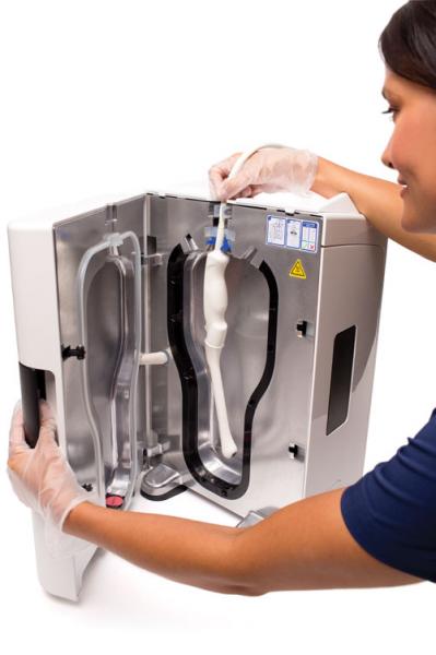 Another challenge is the impact that probe reprocessing has on workflow. Reprocessing involves three steps — pre-cleaning, disinfection and storage — and can be especially resource-intensive. Manual soaking requires one or more rooms typically outfitted with air exchangers to vent toxic fumes; eye wash stations installed nearby for use in case of accidents; and personal protective equipment worn by staff during the soaking process.