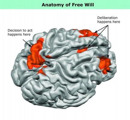 The actual switching of attention from one side to the other was closely linked to activity in the parietal lobe, near the back of the brain. The activity leading up to the choice — that is, the period of deliberation — occurred in the frontal cortex, in areas involved in reasoning and movement, and in the basal ganglia, regions deep within the brain that are responsible for a variety of motor control functions including the ability to start an action. The frontal-lobe activity began earlier than it would have if participants had been told to shift attention, clearly demonstrating that the brain was preparing a purely voluntary action rather than merely following an order.