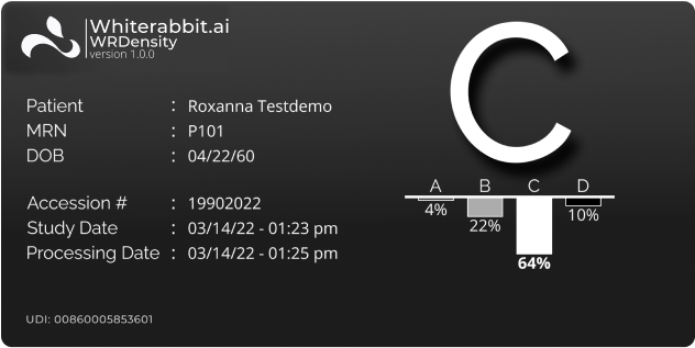 Whiterabbit’s WRDensity is an FDA-cleared AI-driven software that helps radiologists more accurately and more consistently assess breast density.1 Consistent assessment of breast density is vital to effective patient management in support of individualized supplemental screening recommendations to a patient.2
