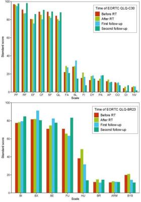 Standard scores of five function and nine symptom scales and an assessment of the global health status of four EORTC QLQ‐C30 questionnaires (top) and standard scores of four function and four symptom scales of four EORTC QLQ‐BR23 questionnaires (bottom). Image courtesy of Rui-Zhi Zhao, Cheng Huang, Tian-Lan Tang, Gui-Qing Shi, Si-Lin Chen, Yu-Ping Lin, Ying Wang, Liu-Qing Jiang, Jin-Hua Chen, Chun-Sen Xu, Fang-Meng Fu, Zhong-Hua Han, Shun-Guo Lin, Chuan Wang, Yong Yang
